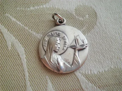 Vintage religious medal of Our Lady Star of the Sea- the front says Ave Maris Stella. The back is marked silver filled JCC - silver filled is just a heavy silver plating. This medal measures approximately 3/4ths inches in diameter without the bail.